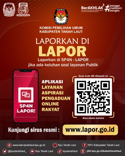 Pernah dengar SP4N-LAPOR!? SP4N-LAPOR! (Sistem Pengelolaan Pengaduan Pelayanan Publik Nasional) adalah kanal resmi untuk menyampaikan aspirasi, pengaduan, dan laporan terkait layanan publik di seluruh Indonesia. Melalui SP4N LAPOR, masyarakat dapat menyampaikan pengaduan, aspirasi, dan permintaan informasi terkait pelayanan publik secara resmi dan mudah. Cara Mudah Mengirim Laporan di SP4N Lapor! : Berikut cara melapor yang baik: - Kunjungi website www.lapor.go.id / aplikasi android SP4N LAPOR! - Uraikan kronologi laporan dengan jelas dan lengkap - Sebutkan waktu dan tempat - Gunakan Bahasa Indonesia yang baik dan benar - Lampirkan bukti pendukung apabila tersedia - Kirimkan laporanmu dan tunggu laporan diverifikasi Semua laporan akan diverifikasi dan diteruskan ke instansi terkait untuk ditindaklanjuti. KPU Kabupaten Tanah Laut berkomitmen mendukung penerapan SP4N LAPOR sebagai sarana pelaporan pengaduan, penyampaian aspirasi dan permintaan informasi. Yuk, gunakan hakmu untuk berpartisipasi dalam perbaikan pelayanan publik! ....
