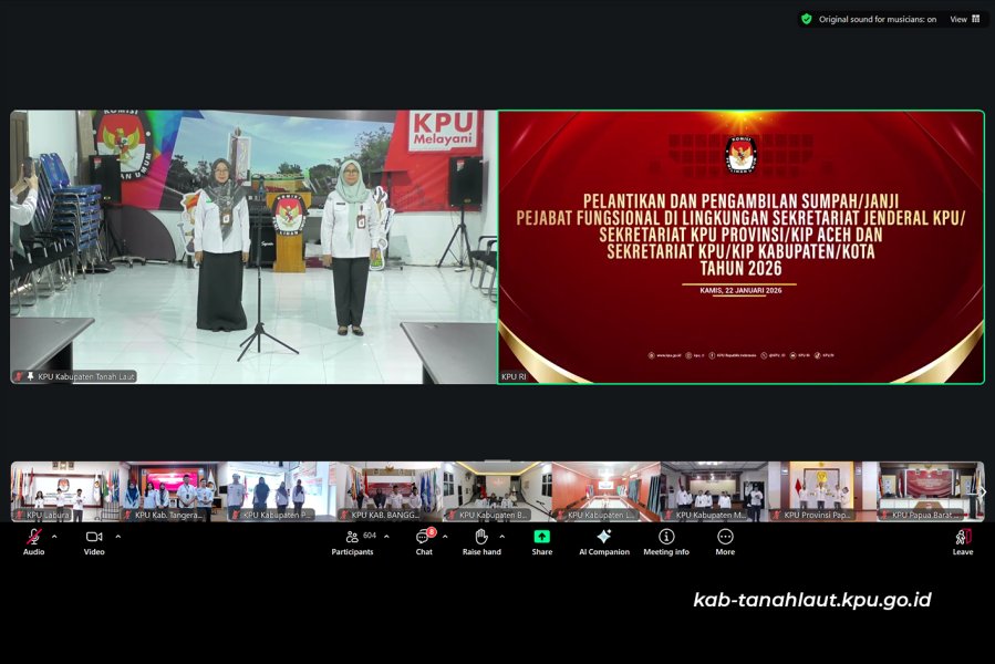 Pelaihari (22/01/2026) Bertempat di Aula KPU Kabupaten Tanah Laut, telah dilaksanakan Pelantikan dan Pengambilan Sumpah/Janji Pejabat Fungsional Penata Kelola Pemilihan Umum di lingkungan Sekretariat Jenderal KPU, Sekretariat KPU Provinsi/KIP Aceh, serta Sekretariat KPU/KIP Kabupaten/Kota Tahun 2026 secara luring dan daring. Kegiatan pelantikan dipimpin oleh Sekretaris Jenderal KPU Bernad Dermawan Sutrisno dan dihadiri oleh Ketua KPU Mochammad Afifuddin. Dalam arahannya, Pimpinan KPU RI menyampaikan pelantikan ini merupakan bagian dari penerapan sistem merit serta bentuk apresiasi atas kinerja aparatur KPU, sekaligus penguatan peran strategis jabatan fungsional dalam mendukung tata kelola kelembagaan yang profesional, akuntabel, dan berintegritas. Pada kesempatan tersebut, Sriransis Marthanoora Bayuhakiki dan Yuli Murniati dari Sekretariat KPU Kabupaten Tanah Laut turut dilantik sebagai Pejabat Fungsional Penata Kelola Pemilihan Umum. ....