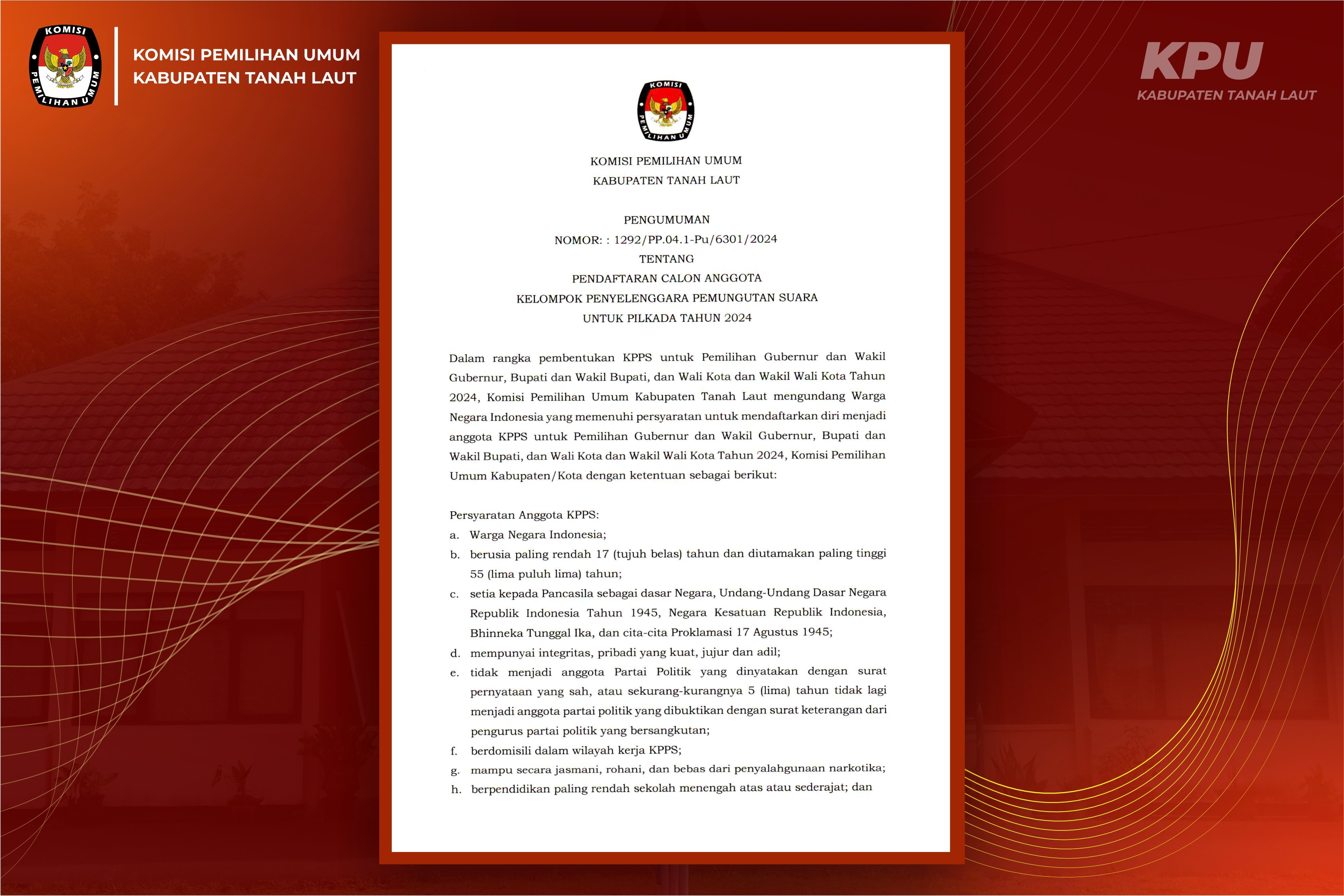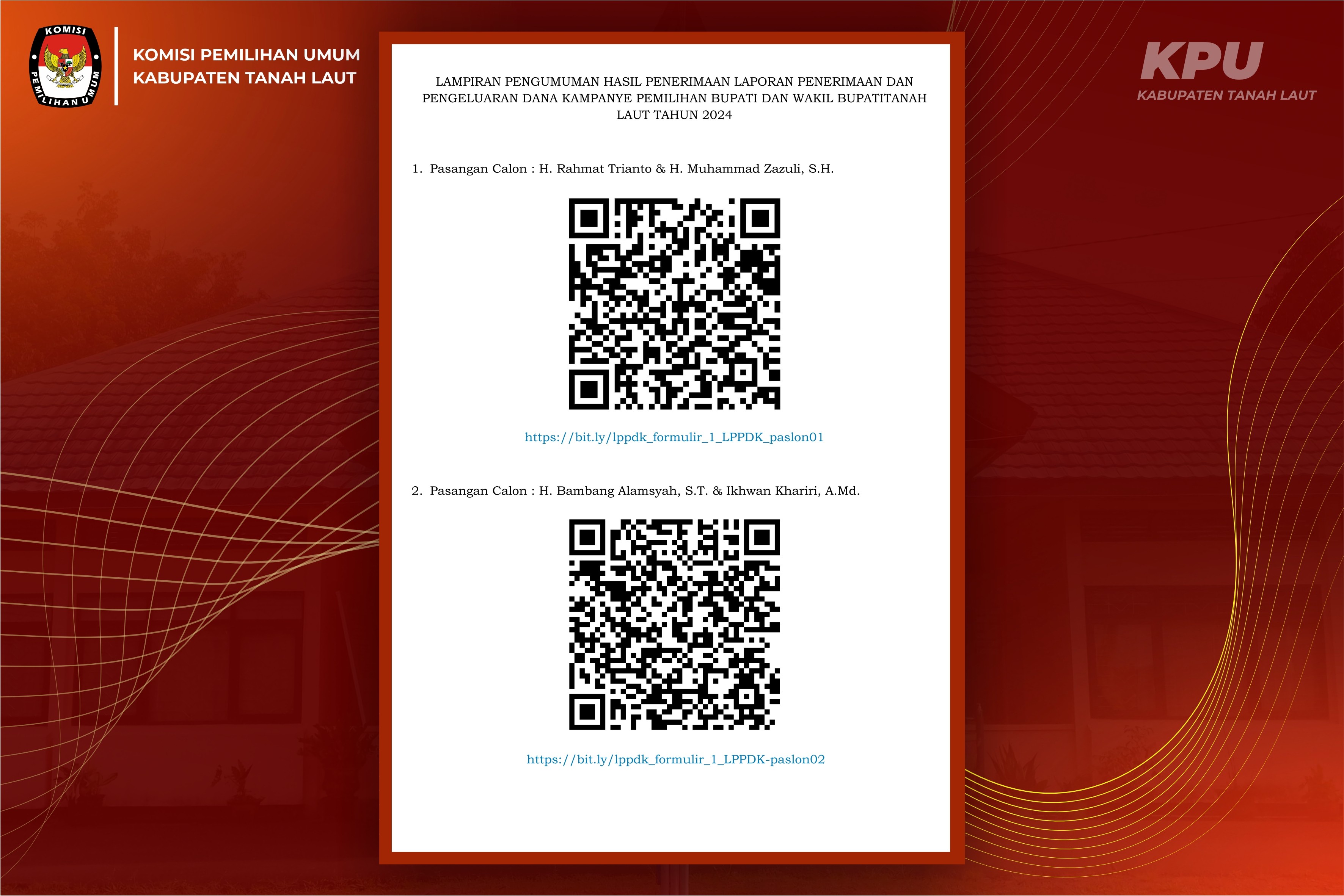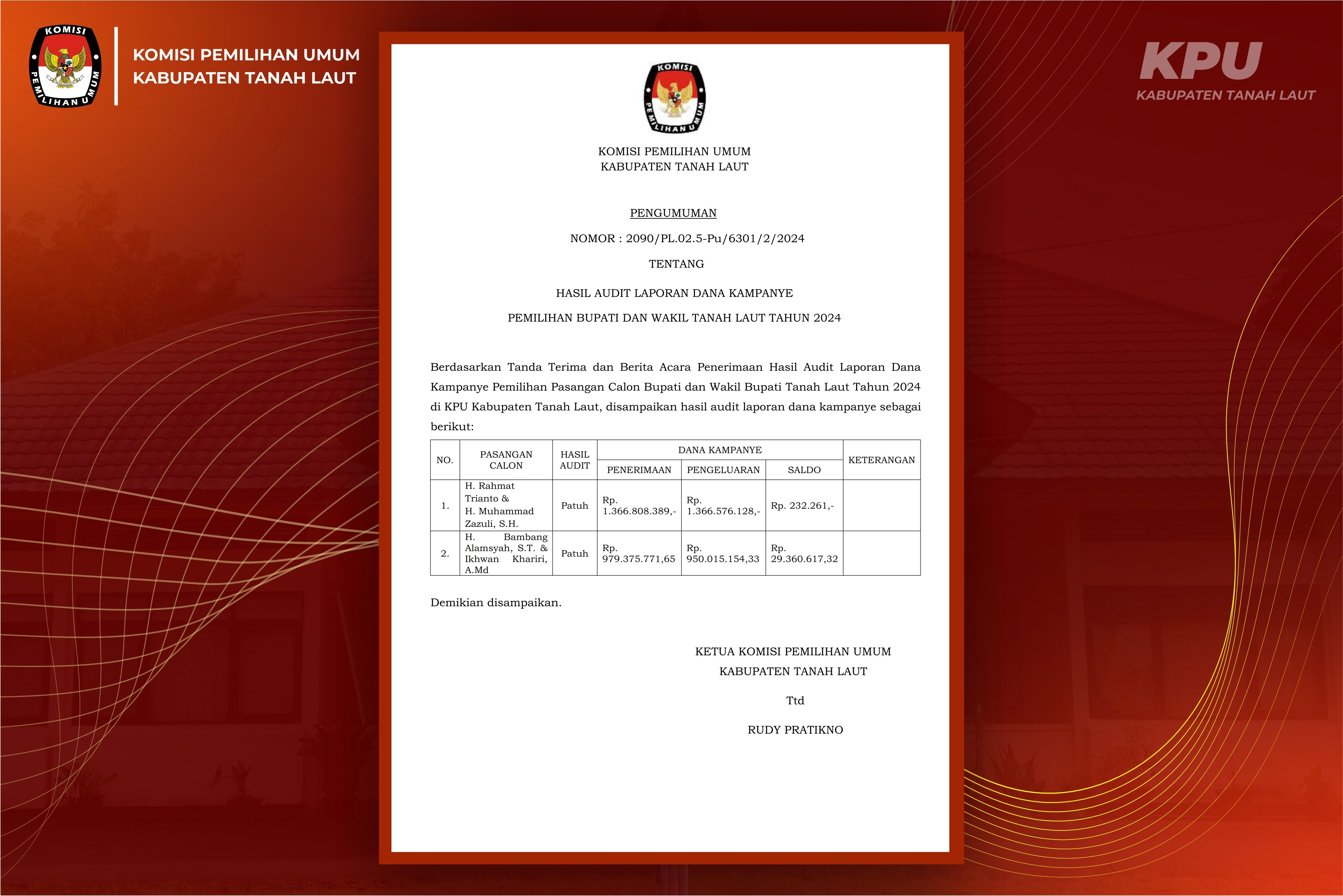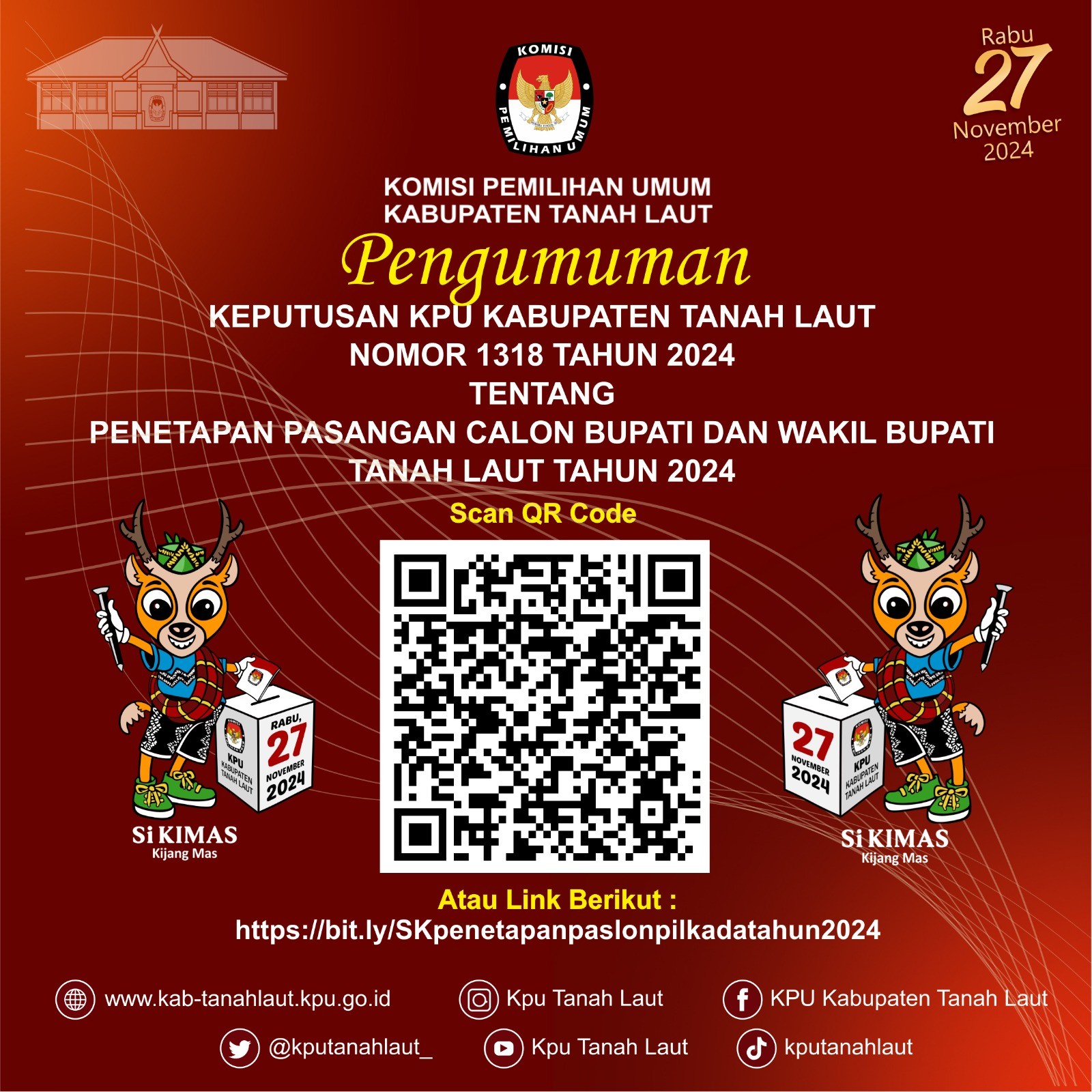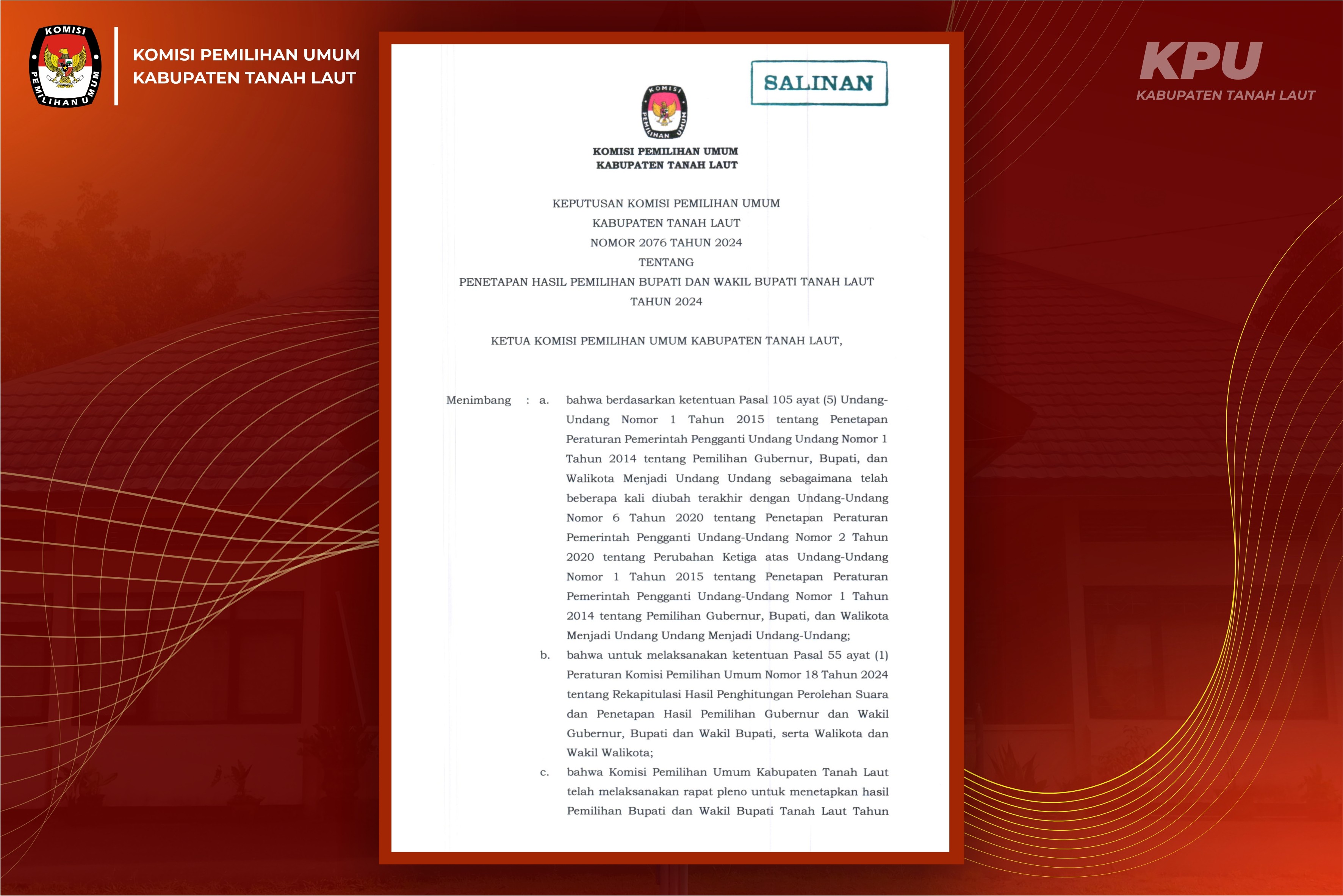 Keputusan Komisi Pemilihan Umum Kabupaten Tanah Laut Nomor 1318 Tahun 2024 Tentang Penetapan Pasangan Calon Peserta Pemilihan Bupati dan Wakil Bupati Tanah Laut Tahun 2024