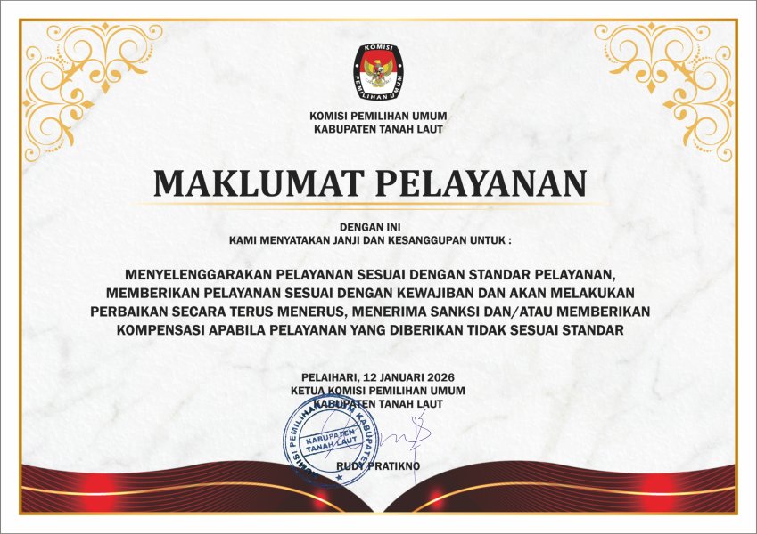 Maklumat Pelayanan ini adalah wujud nyata dari akuntabilitas KPU Kabupaten Tanah Laut kepada Masyarakat.