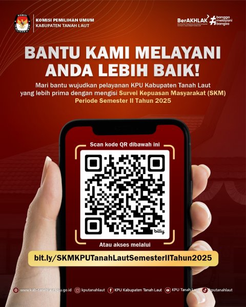 Dalam rangka peningkatan kualitas pelayanan, KPU Kabupaten Tanah Laut mengajak masyarakat untuk berpartisipasi dengan mengisi Survei Kepuasan Masyarakat (SKM) Periode Semester II Tahun 2025.