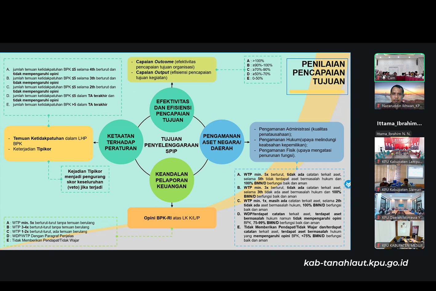 Pelaihari (30/01/2026) Anggota KPU Kabupaten Tanah Laut Divisi Hukum dan Pengawasan, Nazaruddin Ikhwan beserta Tim Asesor Maturitas Penyelenggaraan SPIP Terintegrasi KPU Kabupaten Tanah Laut Tahun 2026 mengikuti Rapat Koordinasi Pelaksanaan Penilaian Mandiri Maturitas Penyelenggaraan SPIP Terintegrasi KPU Tahun 2026, yang diikuti oleh KPU Provinsi/KIP Aceh serta KPU/KIP Kabupaten/Kota se-Indonesia secara daring.