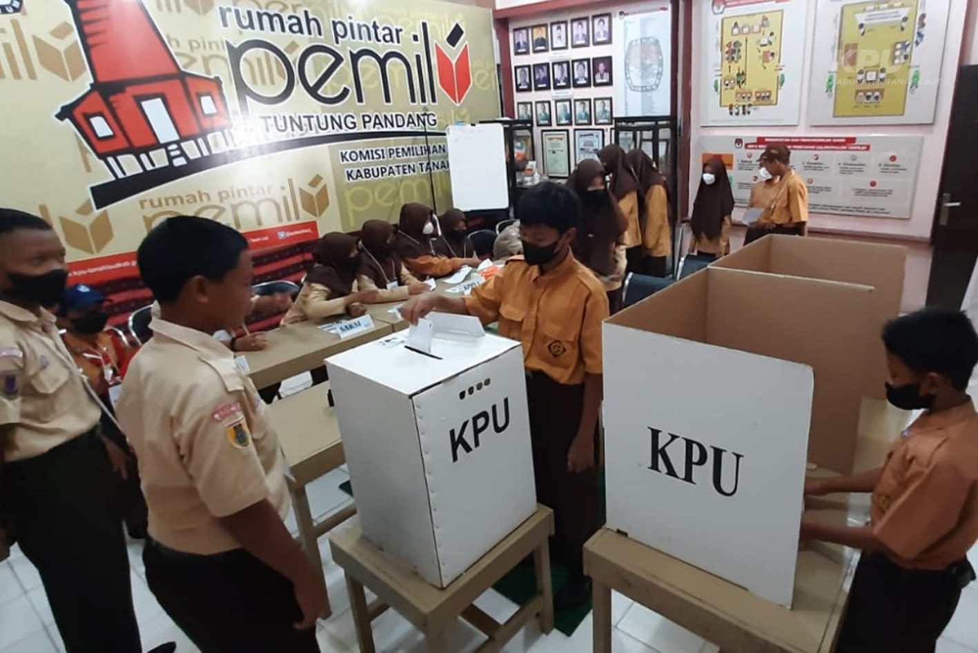 Pada saat yang berbeda para siswa dan guru yang terdiri dari 132 siswa dan 11 dewan guru berkesempatan berkunjungan ke kantor KPU Kabupaten Tanah Laut. Dalam kegiatan ini disampaikan 3 materi yaitu (1) Sistem dan Tahapan Pemilu; (2) Pemilih dan Pemuktahiran Daftar Pemilih; (3) Peserta Pemilu dan teknis pemilihan Di TPS. Tidak Cuma pemaparan materi saja para siswa berkesempatan juga melakukan simulasi Pemungutan dan Perhitungan Suara di Tempat Pemungutan Suara (TPS) (Fasilitas Rumah Pintar Tuntung Pandang KPU Kabupaten Tanah Laut). Dalam hal ini siswa/siswi berperan dan merasakan langsung sebagai Petugas KPPS, Petugas Ketertiban, Pemilih, Saksi Pasangan Calon dan Pengawas TPS. Kegiatan berlangsung ramai, lancar dan terlihat seluruh peserta antusias menikmati peran yang mereka mainkan.