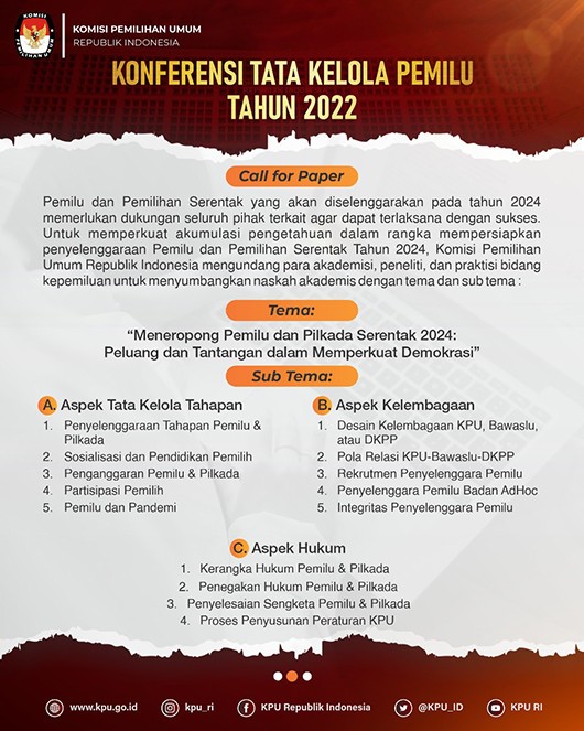Jakarta, kpu.go.id - KPU RI akan menyelenggarakan Call For Paper Tata Kelola Pemilu Tahun 2022, "Meneropong Pemilu dan Pilkada Serentak 2024: Peluang dan Tantangan dalam Memperkuat Demokrasi".