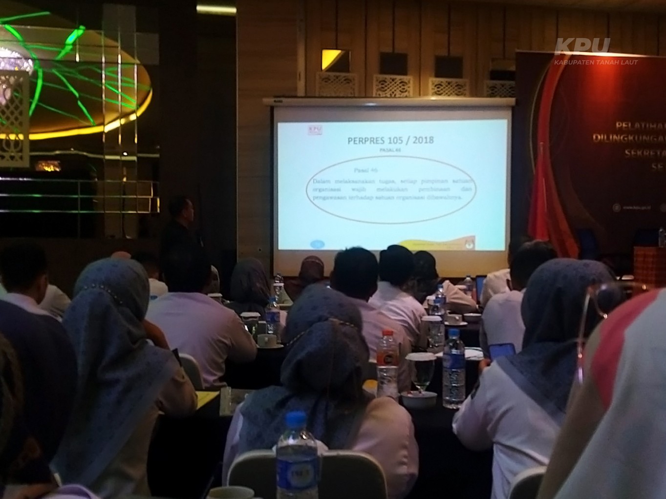 Kegiatan Pelatihan Dasar Tata Kelola Pemilu (TKP) dilanjutkan dengan penyampaian materi oleh Dr. Aries Munandar, AP, S.Sos., M.Si. yang menyampaikan berbagai materi antara lain Dasar-dasar Pemilu dan Demokrasi, Kesekretariatan Penyelenggara Pemilu Independen, Sistem Pengendalian Intern Pemerintah (SPIP), Etos kerja, Kode Etik dan Perilaku ASN dan lain lain. Sebelum kegiatan berakhir, dilakukan pembacaan Fakta Integritas yang dilakukan oleh seluruh Pegawai Negeri Sipil (PNS) KPU dilingkungan Provinsi, Kabupaten dan Kota se Kalimantan Selatan.