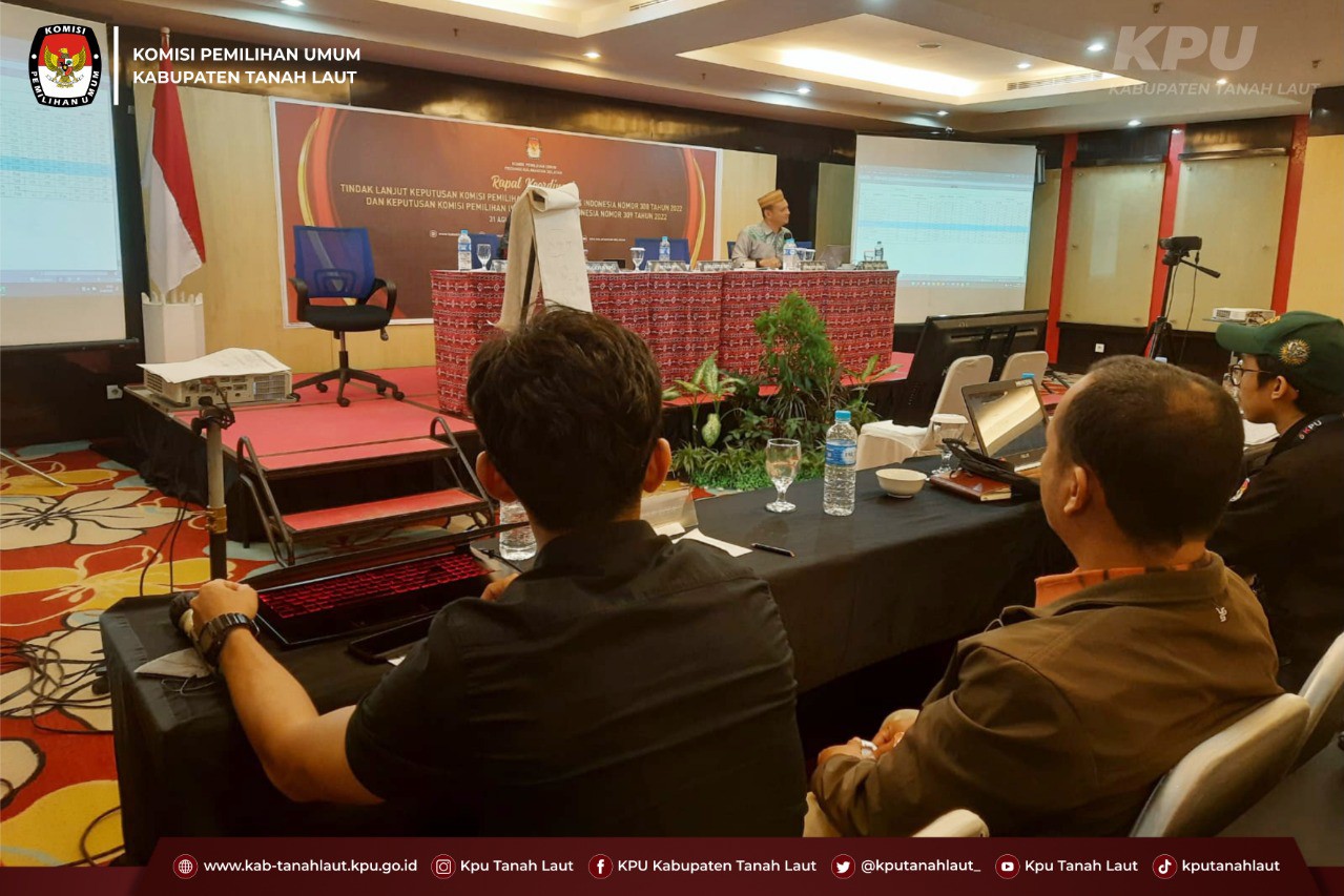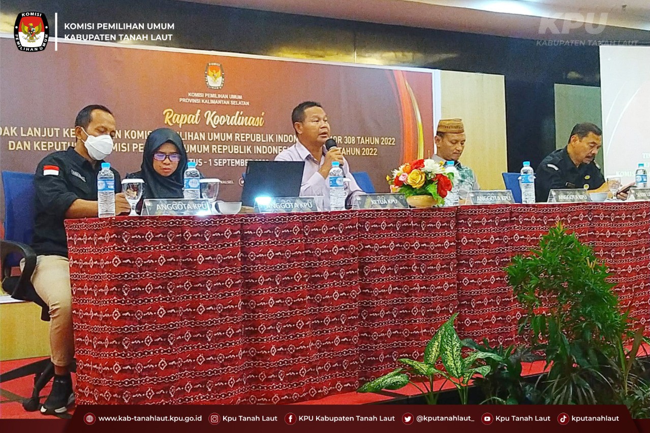 Rabu (31/8/2022) KPU Kabupaten Tanah Laut mengikuti kegiatan Rapat Koordinasi Tindak Lanjut Keputusan Komisi Pemilihan Umum Republik Indonesia Nomor 308 Tahun 2022 dan Keputusan Komisi Pemilihan Umum Republik Indonesia Nomor 309 Tahun 2022 yang diselenggarakan oleh KPU Provinsi Kalimatan Selatan, di Banjarmasin. Kegiatan ini berlangsung selama dua hari yakni sejak tanggal 31 Agustus 2022 s.d 1 September 2022 dan dalam kegiatan ini diikuti oleh KPU Kabupaten/Kota se-Kalimantan Selatan. Tujuan utama dari kegiatan ini adalah menyamakan persepsi mengenai tata cara verifikasi administrasi persyaran Partai Politik Calon Peserta Pemilu Tahun 2024 sesuai dengan Keputusan Komisi Pemilihan Umum Republik Indonesia terbaru Nomor 308 Tahun 2022 dan Nomor 309 Tahun 2022.
