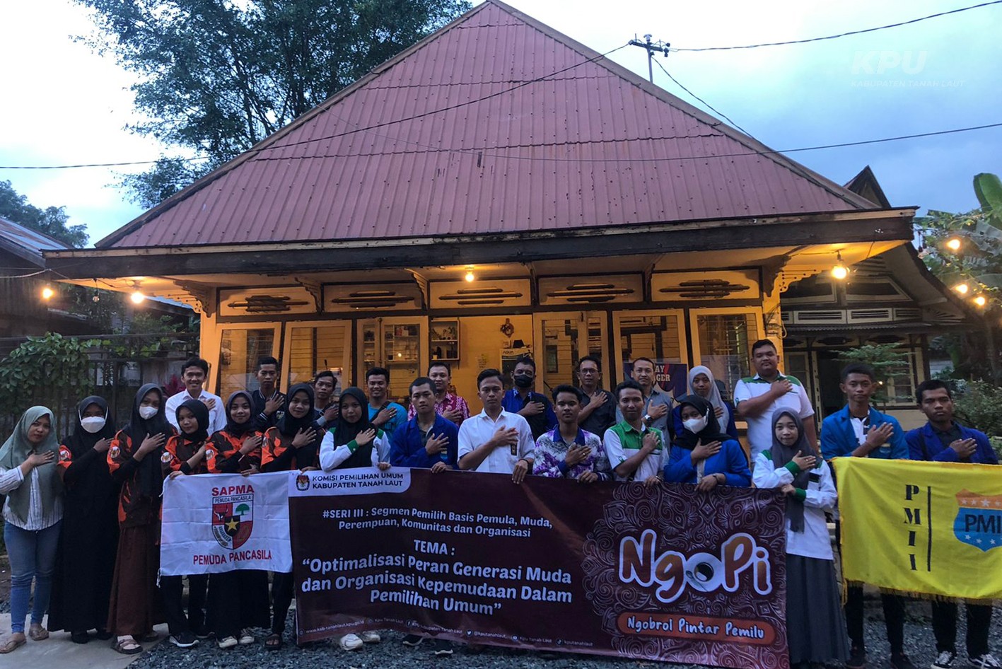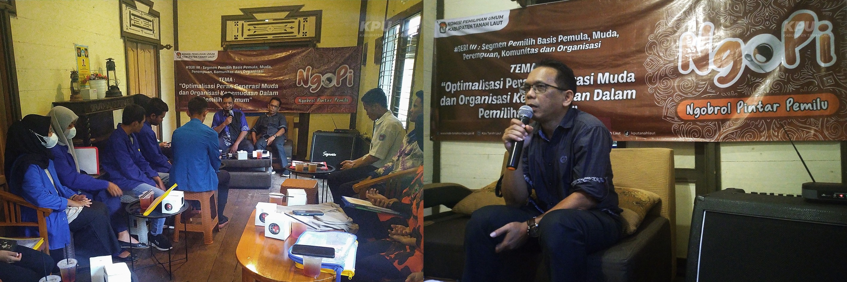 Selanjutnya kegiatan NgoPI (Ngobrol Pintar Pemilu) Seri 3 Segmen Basis Pemilih Pemula, Muda, Perempuan dan Organisasi Tema : Optimalisasi Generasi Muda dan Organisasi Kepemudaan Dalam Pemilihan Umum dilanjutkan dengan penyampaian materi oleh Rudy Pratikno, SE selaku anggota KPU Kabupaten Tanah Laut Divisi Perencanaan, Data dan Informasi yang menyampaikan materi tentang Peran Generasi Muda Dalam Pemilu. Sebelum kegiatan ditutup dilakukan sesi diskusi dan tanya jawab dan diakhiri dengan kegiatan foto bersama.