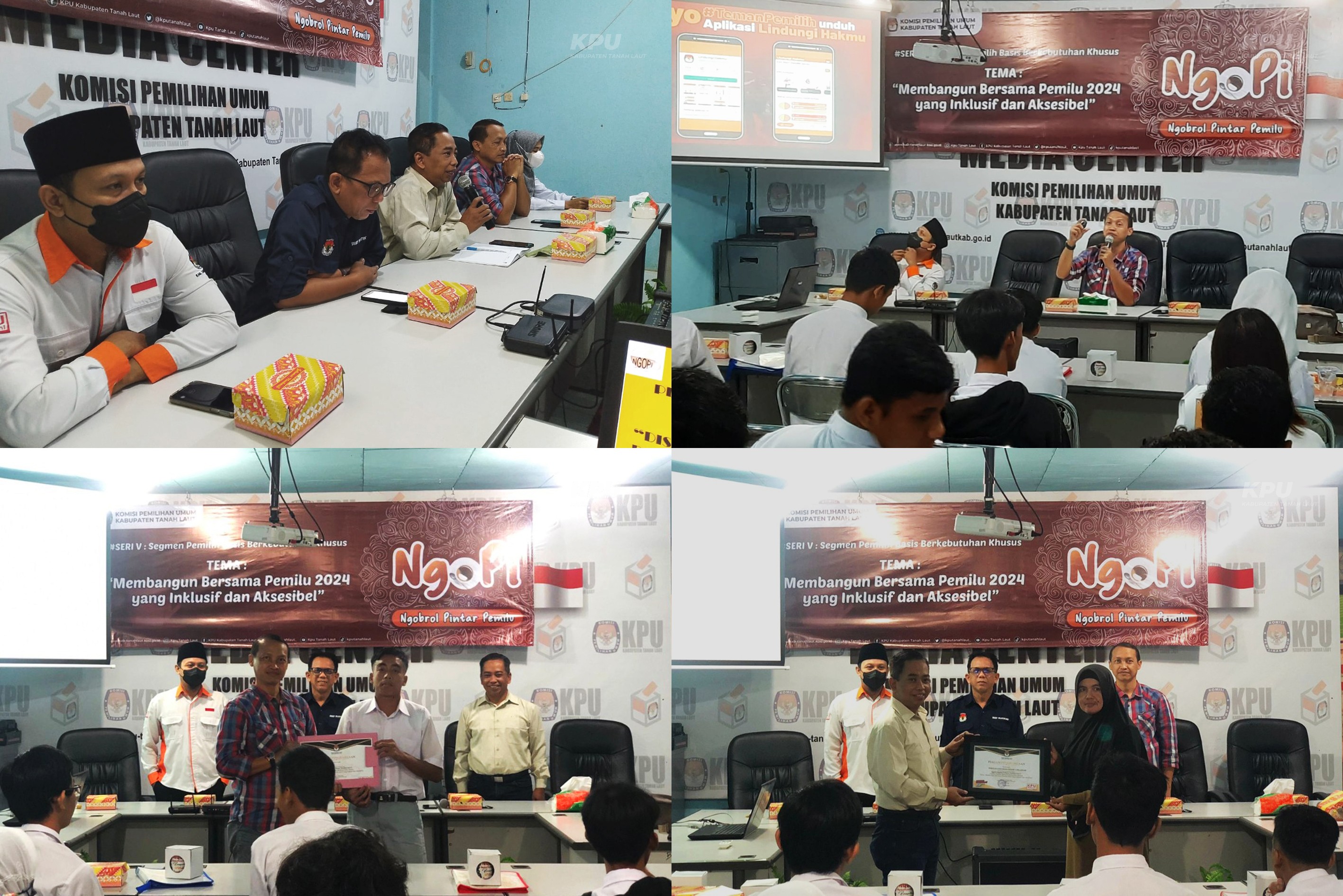 Sebelum kegiatan penyampaian materi kegiatan NgoPI (Ngobrol Pintar Pemilu) Seri 5 Segmen Basis Pemilih berkebutuhan Khusus Tema : Membangun Pemilu 2024 Yang Inklusif Dan Aksesibel berakhir dilakukan sesi diskusi dan tanya jawab bersama peserta kegiatan. Diakhir kegiatan, dilakukan kegiatan penyerahan sertifikat penghargaan dan foto bersama KPU Kabupaten Tanah Laut bersama seluruh undangan.
