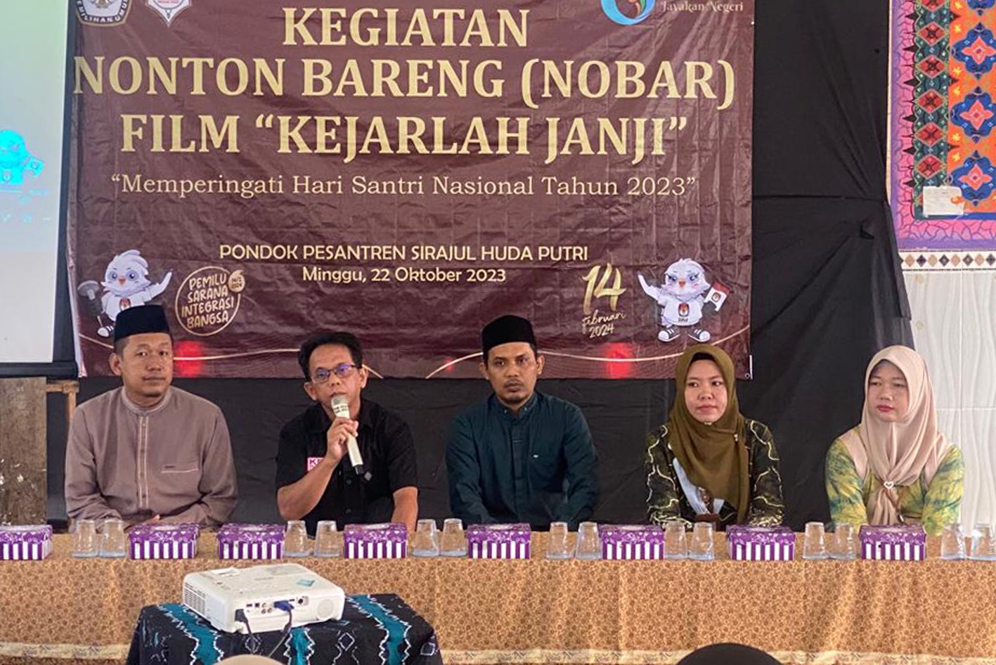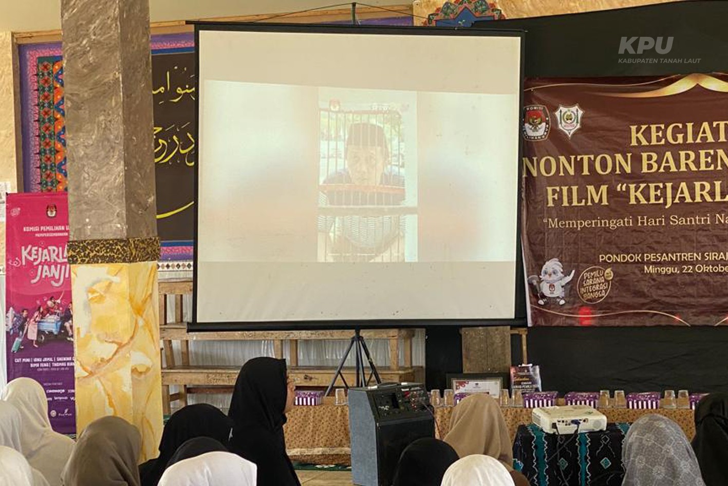 Pelaihari, (22/10/2023) Bertempat di Pondok Pesantren Sirajul Huda Tanah Laut, KPU Kabupaten Tanah Laut menggelar kegiatan Goes To Pesantren dengan melaksanakan giat Nonton Bersama (NoBar) Film “Kejarlah Janji” dalam rangka memperingati Hari Santri Nasional Tahun 2023.