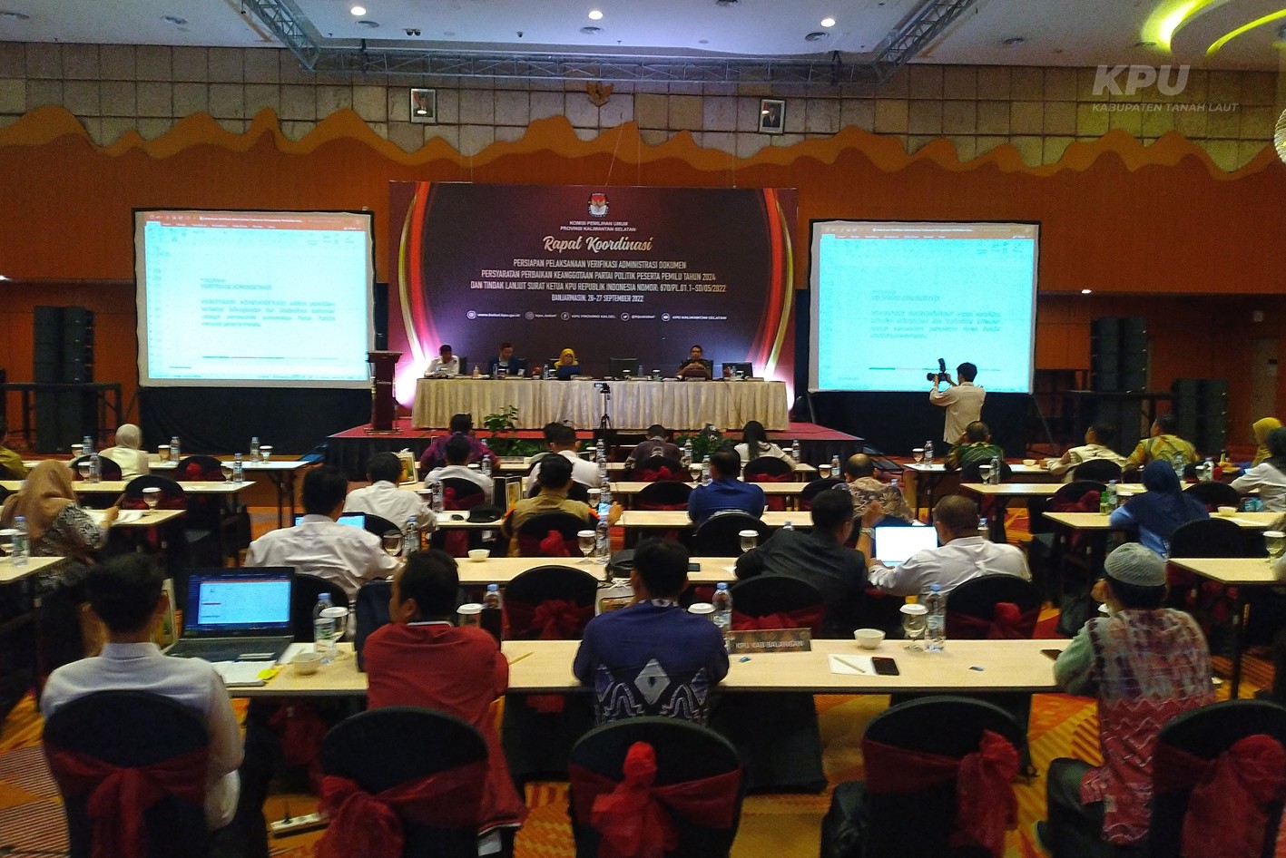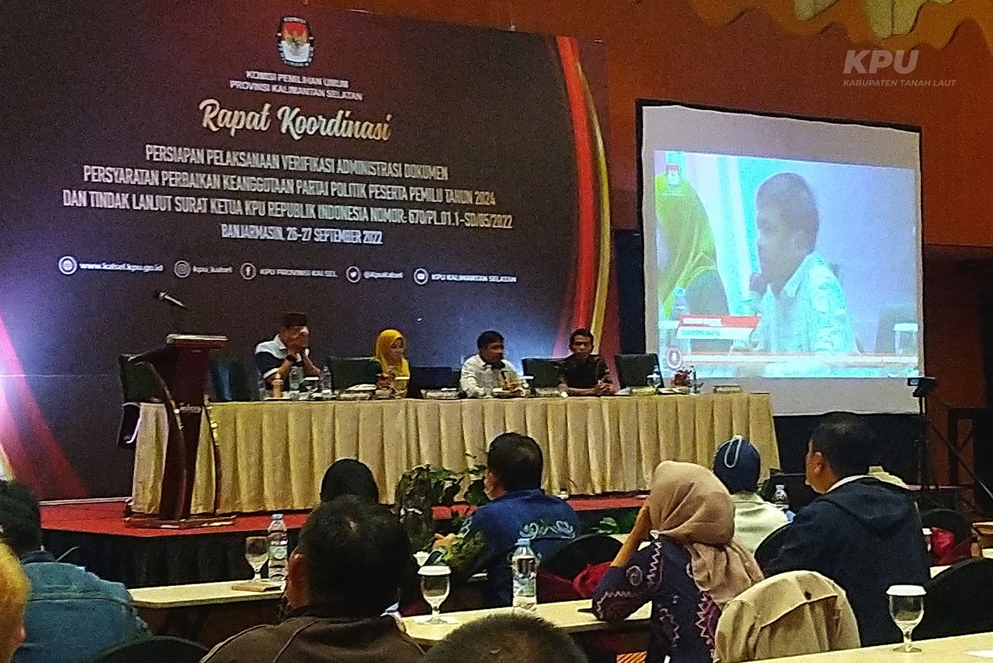 Banjarmasin (26-27/9/2022) KPU Kabupaten Tanah Laut mengikuti Rapat Koordinasi Persiapan Verifikasi Administrasi Dokumen Persyaratan Perbaikan Keanggotaan Partai Politik Peserta Pemilu Tahun 2024 yang diselenggarakan oleh KPU Provinsi Kalimantan Selatan di Banjarmasin. Kegiatan diawali dengan sambutan oleh Ketua KPU Provinsi Kalimantan Selatan, Sarmuji, S.Ag sekaligus membuka kegiatan Rapat Koordinasi.