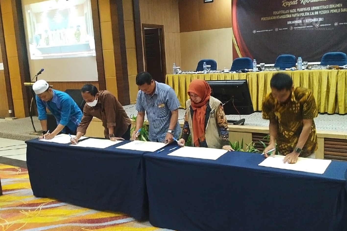 Banjarmasin (11/09/2022), KPU Kabupaten Tanah Laut mengikuti kegiatan Rapat Koordinasi Rekapitulasi Hasil Verifikasi Administrasi Dokumen Persyaratan Keangotaan Partai Politik Calon Peserta Pemilu Tahun 2024 yang diselenggarakan oleh KPU Provinsi Kalimantan Selatan bertempat di Hotel Aria Barito Banjarmasin. Dalam kegiatan ini setiap KPU Kabupaten/Kota diikuti oleh empat orang peserta. Dalam kesempatan ini KPU Kabupaten Tanah Laut dihadiri oleh Ketua KPU Kabupaten Tanah Laut, Arif Mukhyar, Anggota KPU Kabupaten Tanah Laut Divisi Teknis Penyelenggaraan, Muhammad Hanapi, Kasubbag Teknis Penyelenggara, Partisipasi dan Hubungan Masyarakat Hendra Suryana dan Safwansyah selaku verifikator SIPOL KPU Kabupaten Tanah Laut.