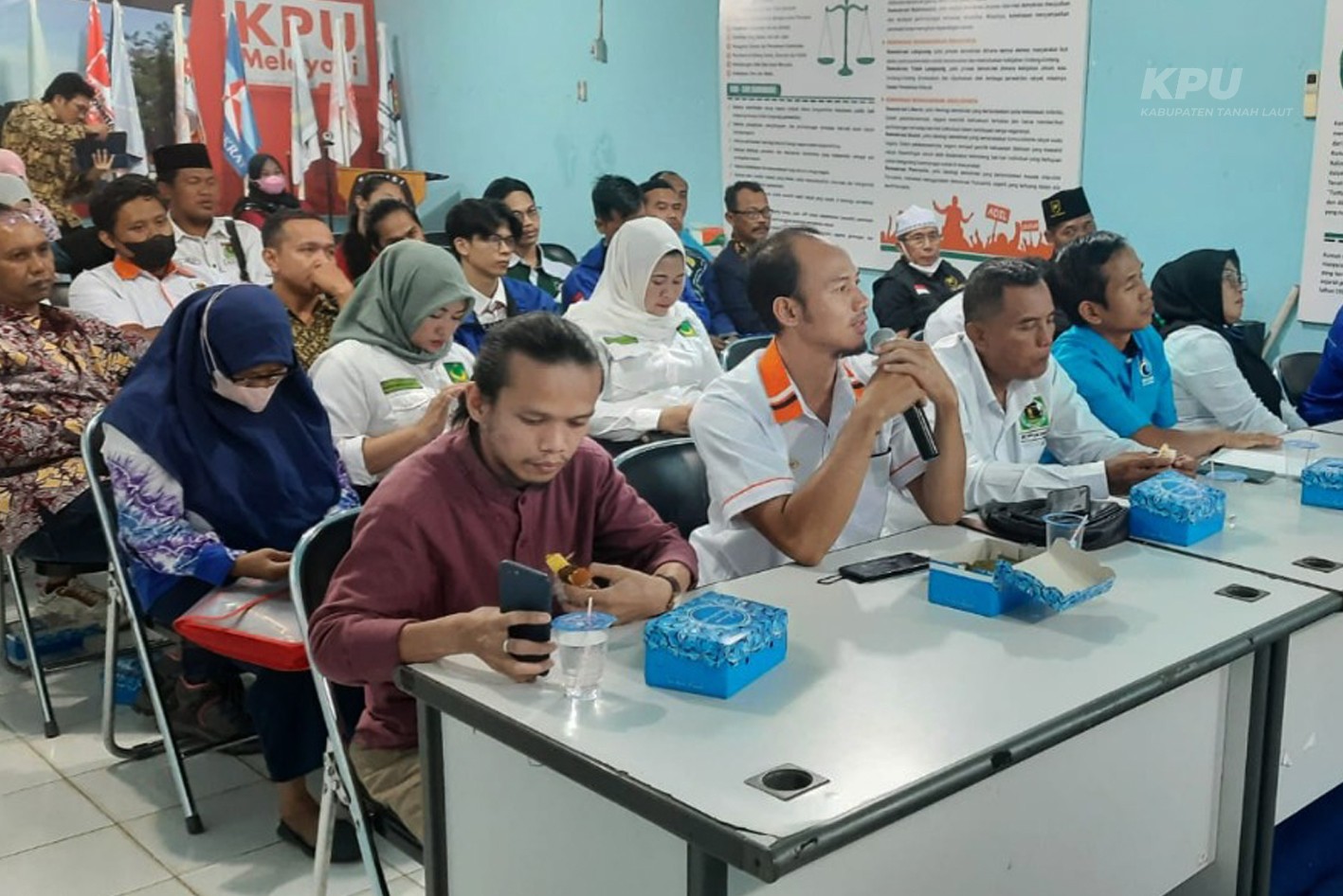 Kegiatan ini diawali dengan sambutan Ketua KPU Kabupaten Tanah Laut Arif Mukhyar sekaligus membuka kegiatan Rapat Koordinasi Tindak Lanjut Bimbingan Teknis Pendaftaran, Verifikasi Dan Penetapan Partai Politik Peserta Pemilihan Umum Tahun 2024. Kemudian kegiatan dilanjutkan dengan pemberian paparan materi oleh Muhammad Hanapi, Anggota KPU Kabupaten Tanah Laut Divisi Teknis Penyelenggaraan KPU Kabupaten Tanah Laut. Dalam penyampaiannya, menjelaskan tentang Pendaftaran, Verifikasi Dan Penetapan Partai Politik Peserta Pemilihan Umum Tahun 2024 dimulai dari dasar hukum, jadwal tahapan, alur tahapan, mekanisme proses verifikasi administrasi dan verifikasi faktual, dan metode penggunaan sampel untuk verifikasi faktual.