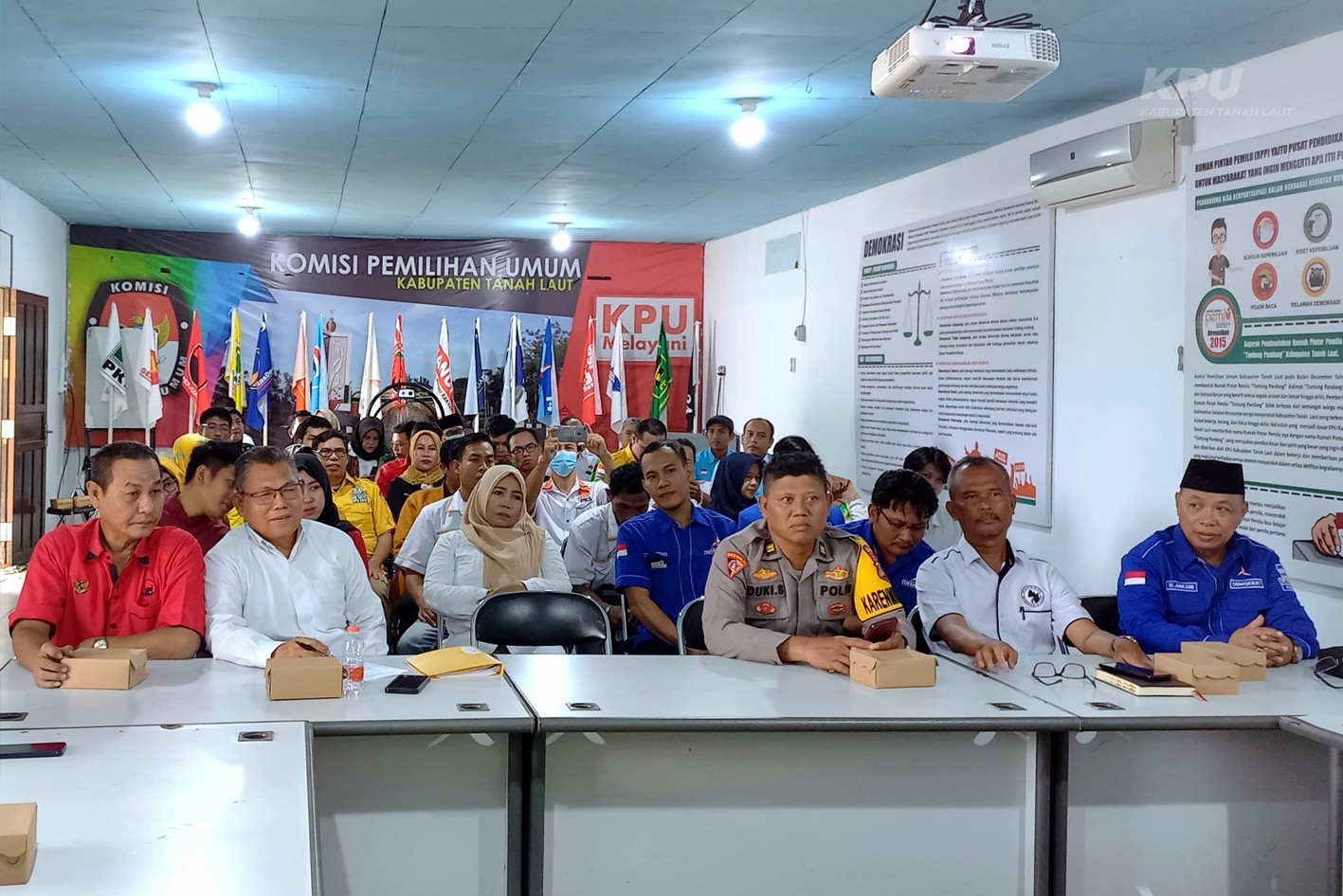Pelaihari (1/11/23) KPU Kabupaten Tanah Laut akan melaksanakan Rapat Koordinasi Validasi Rancangan Surat Suara Calon Anggota DPRD Kabupaten Tanah Laut Pemilu Tahun 2024 bersama 17 Partai Politik Tingkat Kabupaten Tanah Laut. Dalam Kegiatan ini juga dihadiri oleh Bawaslu Kabupaten Tanah Laut dan Polres Tanah Laut.