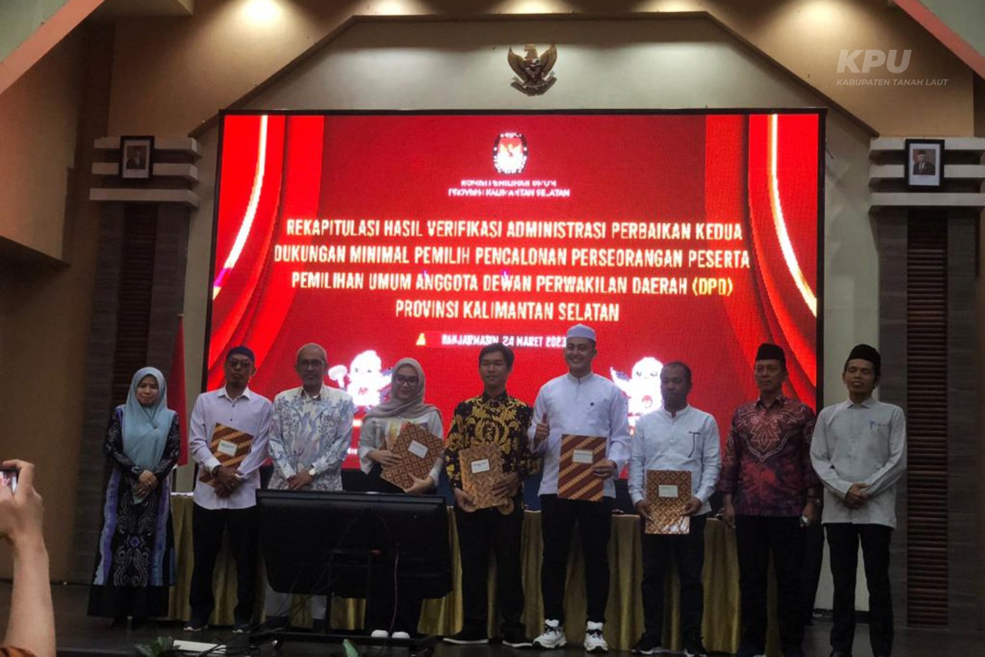 Banjarmasin (24/3/23) KPU Kabupaten Tanah Laut mengikuti kegiatan Rapat Pleno Rekapitulasi Verifikasi Adminitrasi Perbaikan Kedua Dukungan Minimal Pemilih Bakal Calon Perseorangan Anggota Dewan Perwakilan Daerah (DPD) Provinsi Kalimantan Selatan yang dilaksanakan oleh KPU Provinsi Kalimantan Selatan di Banjarmasin. Kegiatan ini dihadiri oleh 13 KPU Kabupaten/Kota dan Bakal Calon serta perwakilan Bakal Calon Perseorangan Anggota Dewan Perwakilan Daerah (DPD). Kegiatan ini dibuka Oleh Plt.Ketua KPU Provinsi Kalimantan Selatan sekaligus Anggota KPU Provinsi Kalimantan Selatan Divisi Perencanaan, Data Dan Informasi, Siswandi Reya'an dan dilanjutkan dengan pembacaan Rekapitulasi Verifikasi Adminitrasi Perbaikan Kesatu Dukungan Minimal Pemilih Bakal Calon Perseorangan Anggota Dewan Perwakilan Daerah (DPD) Provinsi Kalimantan Selatan yang dibacakan oleh Anggota KPU Provinsi Kalimantan Selatan Divisi Teknis Penyelenggaraan, Dr. Hatmiati.