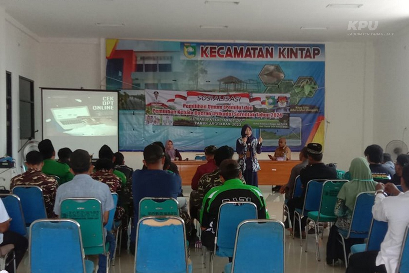 Selasa, (14/11/2023) Bertempat di Aula Kantor Kecamatan Kintap. Badan Kesatuan Bangsa dan Politik Kabupaten Tanah Laut melaksanakan kegiatan Sosialisasi Pemilihan Umum dan Pemilihan Kepala Daerah Serentak Tahun 2024. Yang pada kegiatan tersebut Anggota KPU Kabupaten Tanah Laut bertindak sebagai Narasumber.