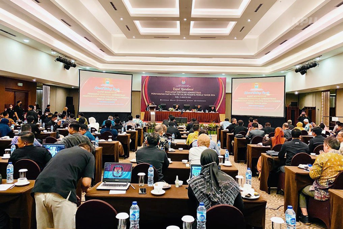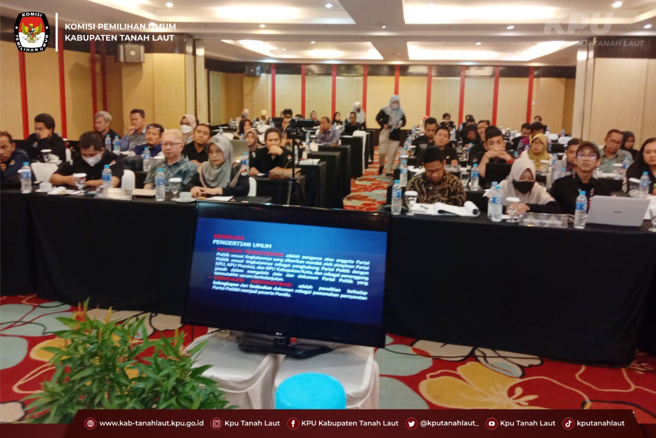 Rabu (10/8/2022) KPU Kabupaten Tanah Laut mengikuti kegiatan Rapat Koordinasi Persiapan Verifikasi Administrasi Persyaratan Partai Politik Calon Peserta Pemilihan Umum Tahun 2024 yang diselenggarakan oleh KPU Provinsi Kalimatan Selatan, di Banjarmasin. Kegiatan ini diikuti oleh KPU Kabupaten/Kota se Kalimantan Selatan. Tujuan utama dari kegiatan ini adalah menyamakan persepsi mengenai tata cara verifikasi administrasi persyaran Partai Politik Calon Peserta Pemilu Tahun 2024. Dalam Kegiatan Rapat Koordinasi Persiapan Verifikasi Administrasi Persyaratan Partai Politik Calon Peserta Pemilihan Umum Tahun 2024 diawali dengan sambutan Ketua KPU Provinsi Kalimantan Selatan, Sarmuji, S.Ag., M.Ag. sekaligus membuka kegiatan Rapat Koordinasi. Kegiatan selanjutnya yakni penyampaian materi dan arahan dari semua anggota KPU Provinsi Kalimantan Selatan yang diawali oleh Edy Ariansyah, S.IP., M. Si. yang memberikan materi tentang Ketentuan Verifikasi Administrasi Persyaratan Partai Politik Calon Peserta Pemilu Tahun 2024, dilanjutkan Dr. Hatmiati, M.Pd. yang memberikan materi tentang Pedoman Teknis Bagi KPU Kabupaten/Kota dalam pelaksanaan Verifikasi Administrasi. Materi ketiga yakni tentang simulasi penghitungan sampel verifikasi vaktual oleh Siswandi Reya'an, S.Pd. dan diakhir dengan penyampaian materi oleh Dr. H. Nur Zazin, M.A. yang membahas tentang Potensi Hukum tahapan pendaftaran, verifikasi dan penetapan partai politik calon peserta pemilu tahun 2024.Kegiatan ini, KPU Kabupaten Tanah Laut daam kegiatan rapat koordinasi ini dihadiri oleh Ketua dan seluruh anggota KPU Kabupaten Tanah Laut, Sekretaris, Kasubbag Teknis Penyelenggara Pemilu, Partisipasi dan Hubungan Masyarakat dan Operator SIPOL.