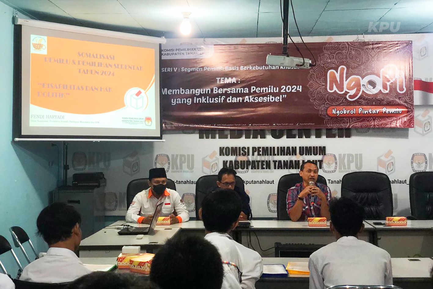 Pelaihari (30/9/2022) KPU Kabupaten Tanah Laut melaksanakan kegiatan NgoPI (Ngobrol Pintar Pemilu) Seri 4 Segmen Basis Pemilih Warga Internet (Netizen) Tema : "Pemilu Dalam Genggaman" (Positif dan Negatif Media Sosial dan Internet - Antara Edukasi dan Disinformasi). Kegiatan diawali dengan sambutan Anggota KPU Kabupaten Tanah Laut Divisi Hukum dan Pengawasan Akhmad Rozi, S.Sos., M.Si sekaligus membuka kegiatan. Kegiatan selanjutnya yakni penyampaian materi oleh Muhammad Hanapi selaku anggota KPU Kabupaten Tanah Laut Divisi Teknis Penyelenggaraan yang menyampaikan materi tentang Pengaruh Internet dan Media Sosial dalam Pemilu. Diawal penyampaiannya Muhammad Hanapi menyampaikan mengenai Demokrasi, Pemilu dan Pemilihan, serta Asas Pemilu dan Pemilihan “LUBER & JURDIL” serta penjelasan mengenai penyelenggara Pemilu di Indonesia. Selanjutnya Muhammad Hanapi masuk dalam materi inti yakni terkait peran warga net dalam pemilu dan demokrasi, gangguan informasi dan hoaks yang dalam kesempatan ini Muhammad Hanapi menjelaskan tentang perbedaan Mis-Informasi, Dis-Informasi dan Mal-Informasi. Selanjutnya dijelaskan mengenai jenis-jenis Mis-informasi dan Dis-informasi serta tujuan munculnya berita hoaks dan secara terperinci menjelaskan alur dan sarana penyebaran hoaks, dampak dan contoh penyebaran hoaks. Dalam materi penyampaiannya memberikan cara identifikasi berita hoaks dan cara menagkalnya serta disampaikan Ancaman dan Sanksi Hukum terkait penyebaran berita hoaks. Sebelum kegiatan penyampaian materi kegiatan NgoPI (Ngobrol Pintar Pemilu) Seri 4 Segmen Basis Pemilih Warga Internet (Netizen) dengan Tema : “Pemilu Dalam Genggaman” (Pengaruh Positif dan Negatif Internet dan Media Sosial - Antara Edukasi dan Disinformasi) berakhir dilakukan sesi diskusi dan tanya jawab bersama peserta kegiatan. Diakhir kegiatan, dilakukan kegiatan penyerahan sertifikat penghargaan dan foto bersama KPU Kabupaten Tanah Laut bersama seluruh undangan.