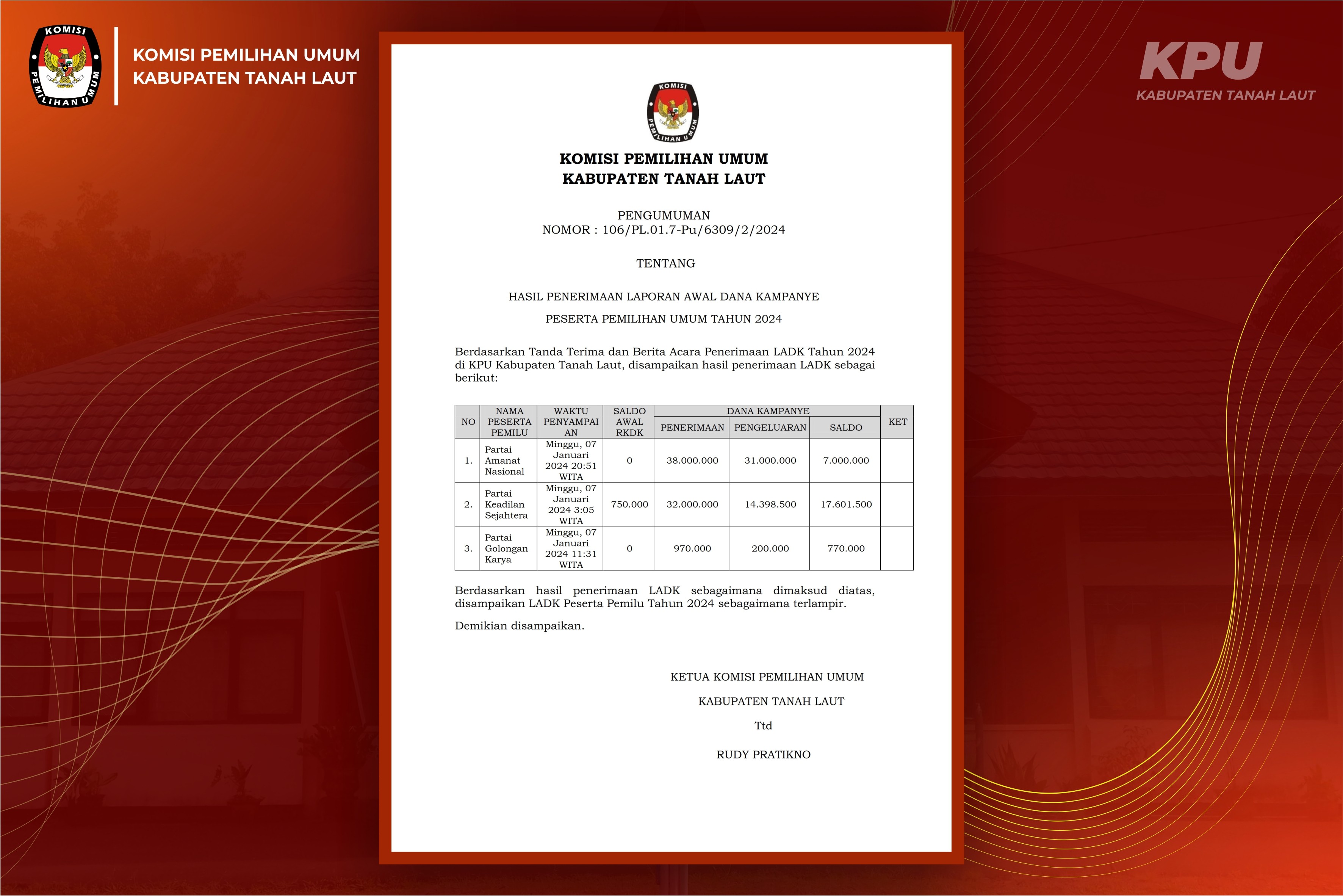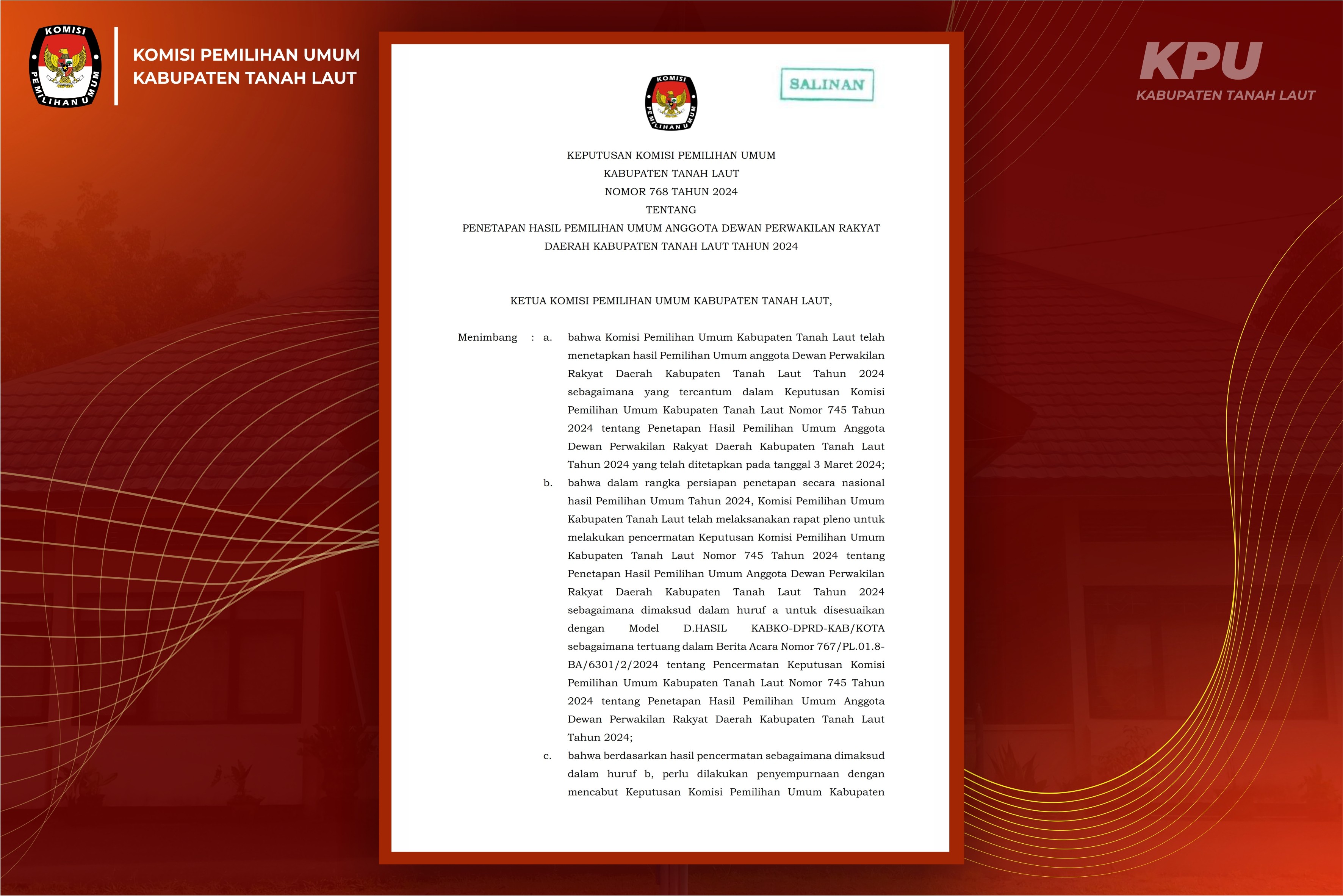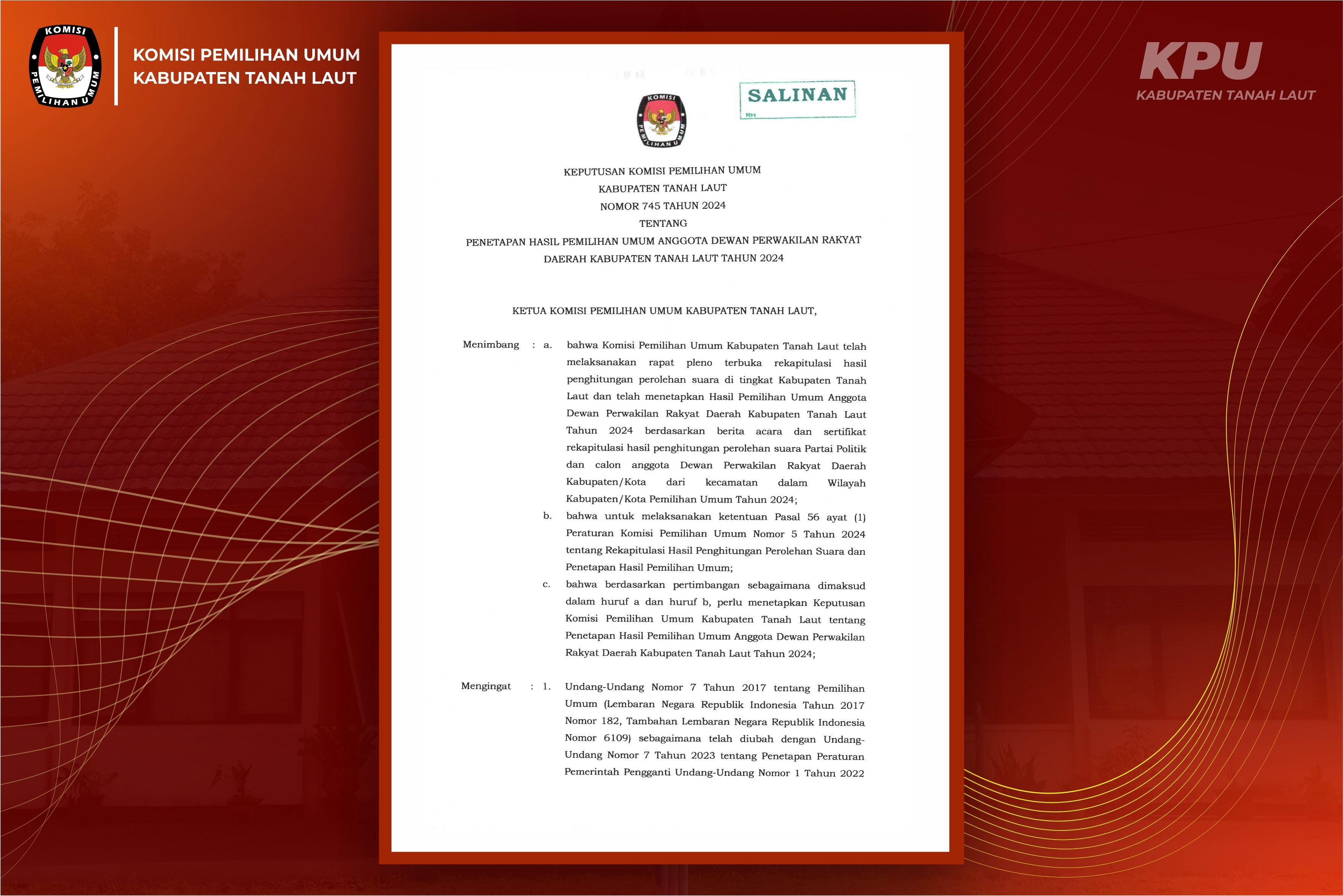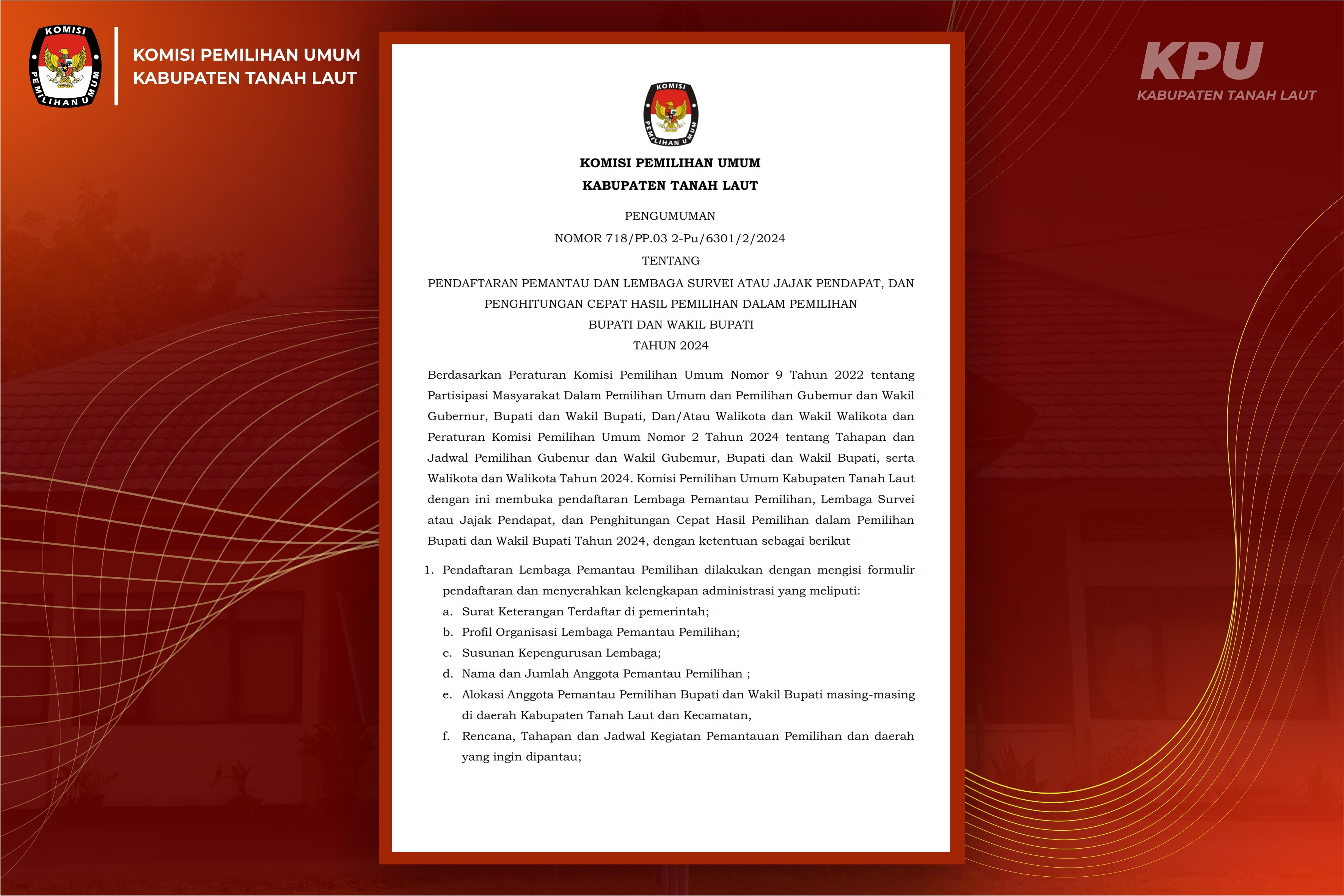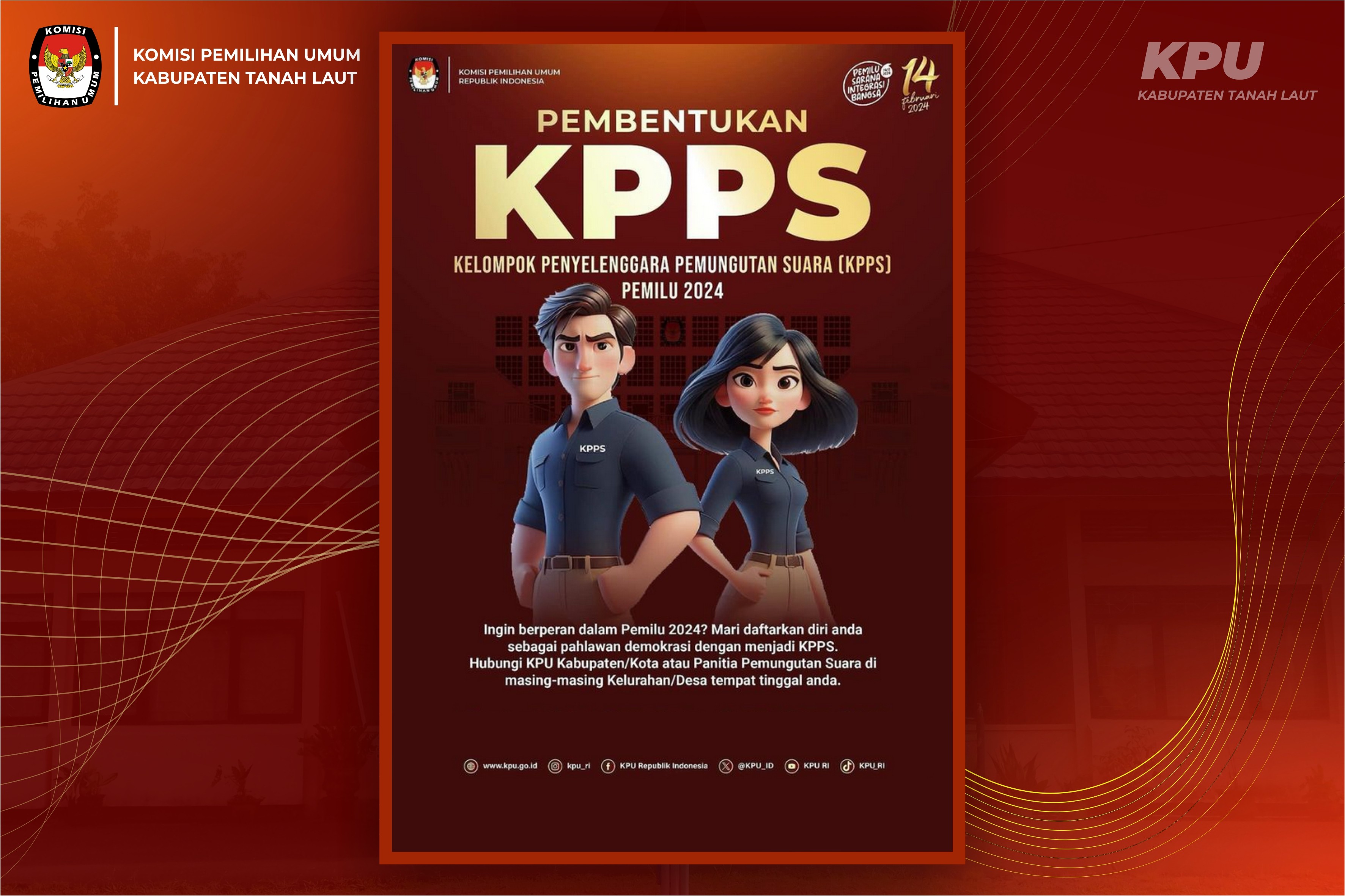 Berikut Pengumuman KPU Kabupaten Tanah Laut Nomor 1299/PP.04.1-Pu/6301/2023 tentang Seleksi Calon Anggota Kelompok Penyelenggara Pemungutan Suara (KPPS) Pemilihan Umun Tahun 2024. Pendaftaran dimulai pada tanggal 11 s.d 20 Desember 2024. Yuk lengkapi persyaratannya dan jadi bagian Penyelenggara Pemilu 2024.