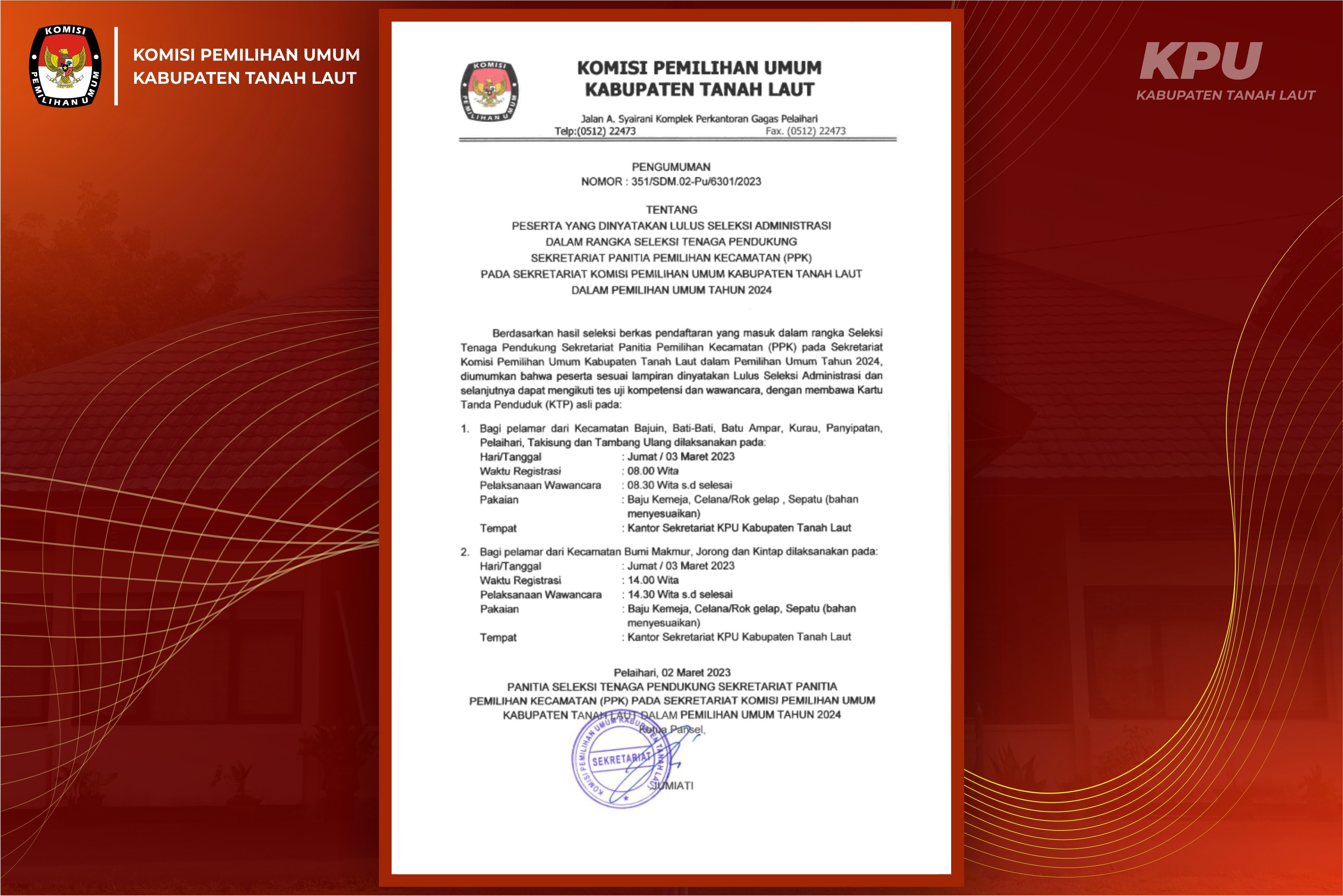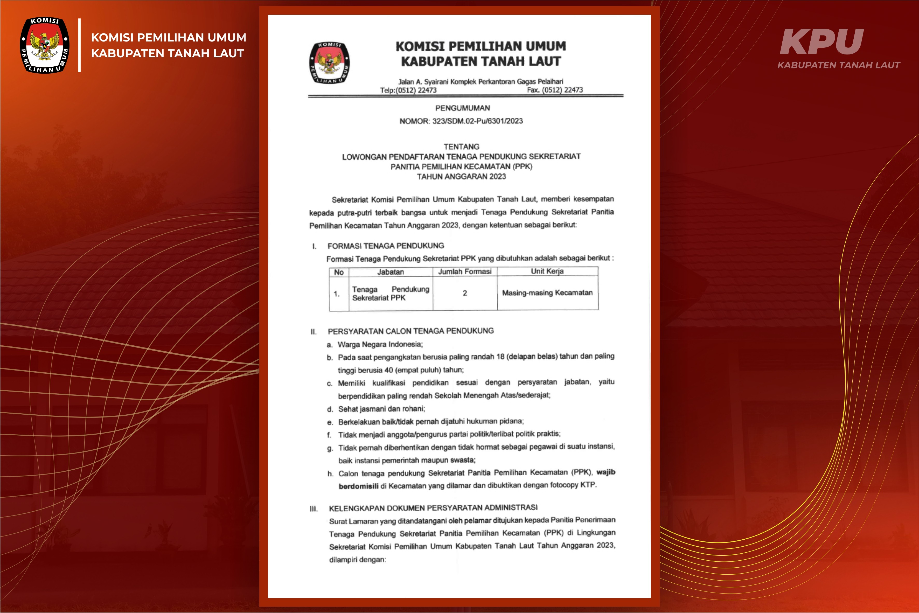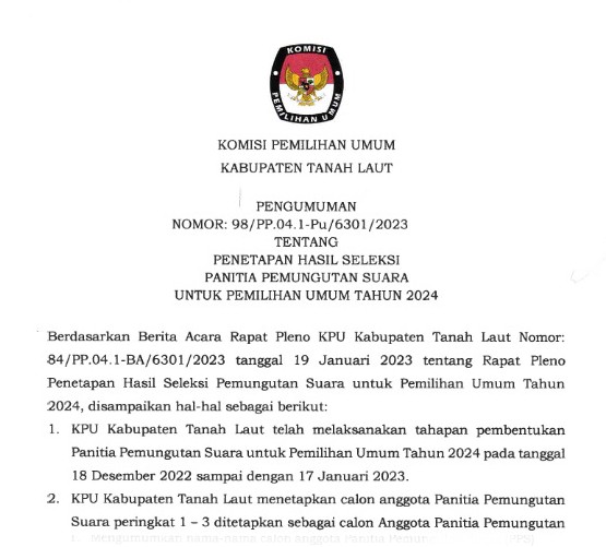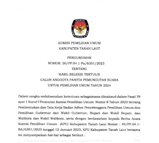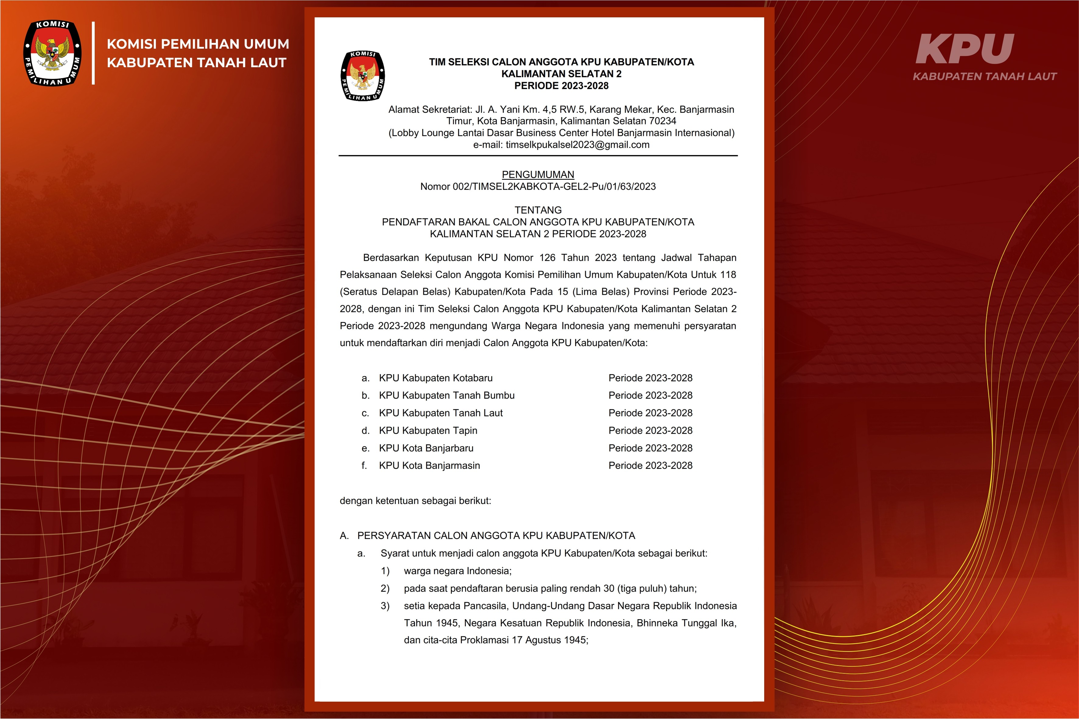 Berdasarkan Keputusan KPU Nomor 126 Tahun 2023 tentang Jadwal Tahapan Pelaksanaan Seleksi Calon Anggota Komisi Pemilihan Umum Kabupaten/Kota Untuk 118 (Seratus Delapan Belas) Kabupaten/Kota Pada 15 (Lima Belas) Provinsi Periode 2023- 2028, dengan ini Tim Seleksi Calon Anggota KPU Kabupaten/Kota Kalimantan Selatan 2 Periode 2023-2028 mengundang Warga Negara Indonesia yang memenuhi persyaratan untuk mendaftarkan diri menjadi Calon Anggota KPU Kabupaten/Kota :