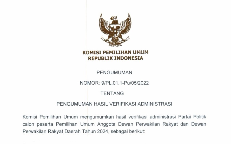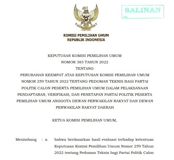 Keputusan Komisi Pemilihan Umum Nomor 383 Tahun 2022 tentang Perubahan Keempat atas Keputusan Komisi Pemilihan Umum Nomor 259 Tahun 2022 tentang Pedoman Teknis Bagi Partai Politik Calon Peserta Pemilihan Umum Dalam Pelaksanaan Pendaftaran, Verifikasi, dan Penetapan Partai Politik Peserta Pemilihan Umum Anggota Dewan Perwakilan Rakyat dan Dewan Perwakilan Rakyat Daerah